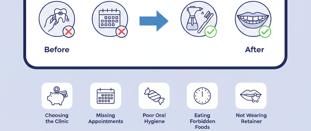 في هذت المقال، سنكشف أكثر الأخطاء الشائعة أثناء تقويم الأسنان، ونوضح كيفية تجنبها خطوة بخطوة لضمان ابتسامة صحية ونتائج دائمة.